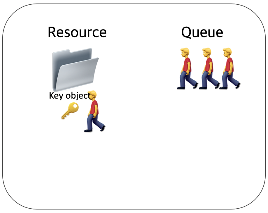 이것이 뮤텍스가 동작하는 방식이다. 화장실을 이용하는 사람은 프로세스 혹은 쓰레드이며 화장실은 공유자원, 화장실 키는 공유자원에 접근하기 위해 필요한 어떤 오브젝트이다.