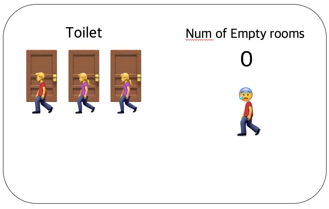 모든 칸에 사람이 들어갔을 경우 빈 칸의 개수는 0이 되며 이때 화장실에 들어가고자 하는 사람이 있다면 빈 칸의 개수가 1로 바뀔 때까지 기다려야 한다.