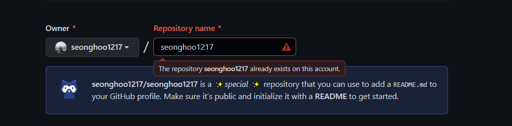 우선 제 GitHub를 보시면 위 사진에서 눈치 채신분들도 있으시겠지만 README파일의 경로가 제 이름으로 된 Repo밑에 있습니다. 그렇기 때문에 우선 자신의 GitHub아이디 이름으로 된 레포지토리를 하나 생성해줄 것입니다.