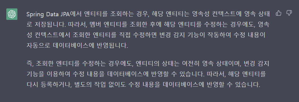 하지만, 내 코드는 멤버를 Spring Data JPA로 조회 후 그 조회한 Member Entity를 바로 변경감지를 통해 필드값을 수정한다.