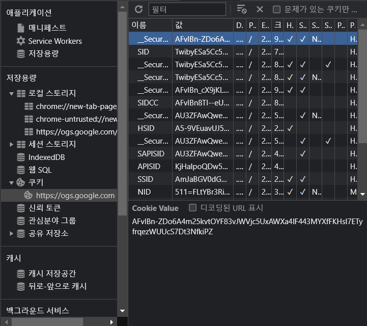 해당 사진은 크롬 브라우저 기준 구글 메인 화면에서 사용되는 쿠키들의 정보이다.