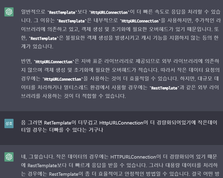 RestTemplate은 HttpURLConnection 방식을 이용하면서도 여타 라이브러리에 의존하고 오버헤드를 일으킬 가능성이 있어 조금 더 무거운 반면에, HttpURLConnection은 JDK에서 제공하기에 오버헤드가 적고 라이브러리를 쓰지않아 경량화 되어있어, 소규모의 데이터 처리는 HttpURLConnection의 속도가 더빠르게 보장될 수 있다는 점이다.