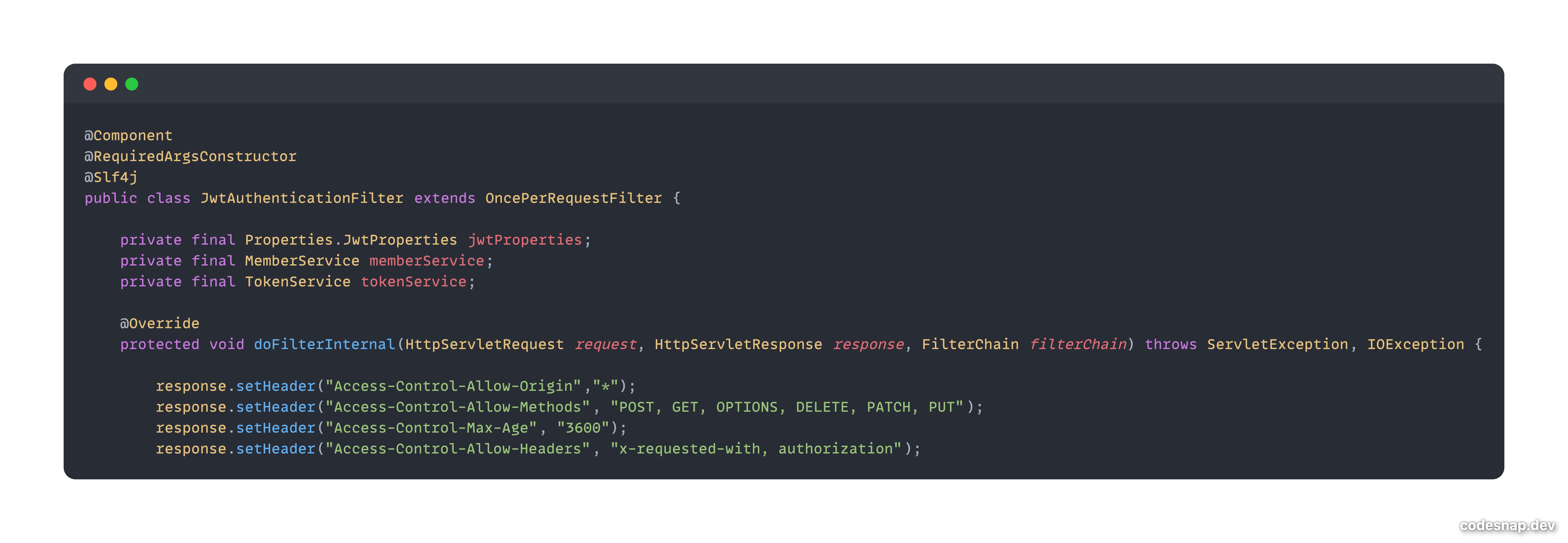 마지막으로 문제가 되었던 부분이 CustomFilter를 작성한 JWT관련 Filter 부분이었다.