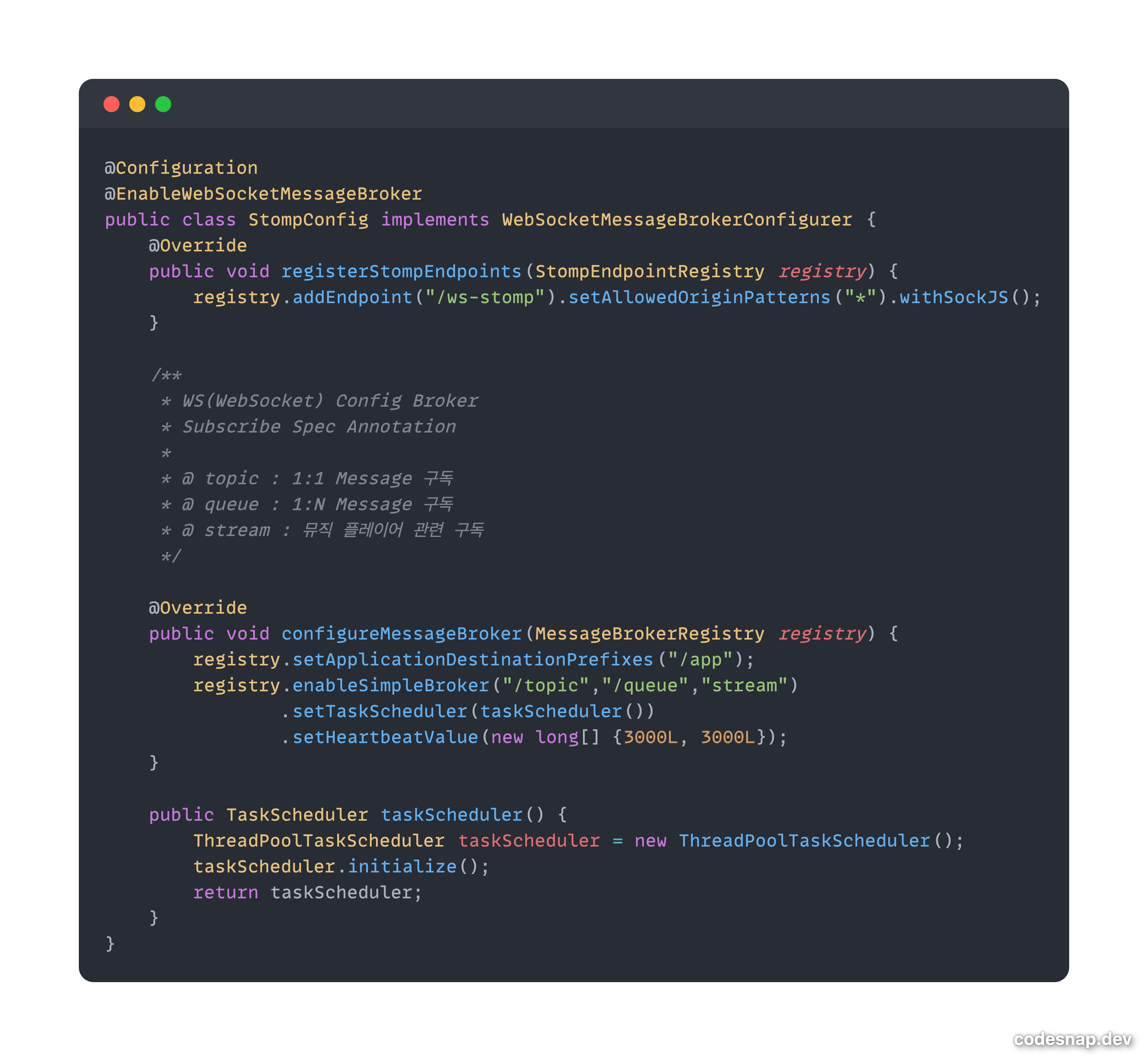 첫 번째는 STOMP 관련 Config 클래스로 MessageBroker를 상속받은 형태의 클래스이다.