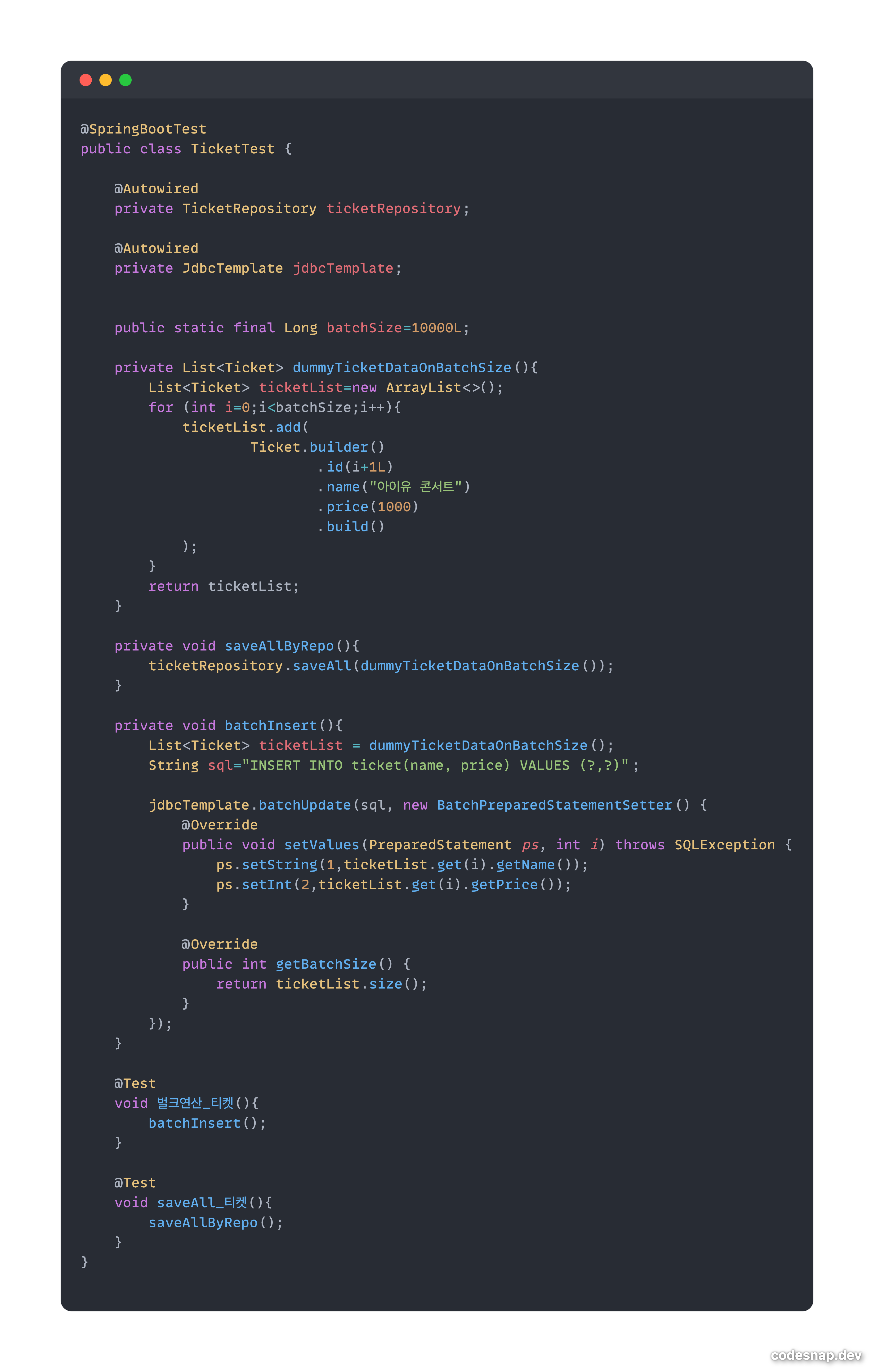 그렇기에 JDBCTemplate의 batchUpdate()를 이용하여, 쿼리 효율성을 높여주게 되면 더 빠른 실행속도를 보장받을 수 있다.