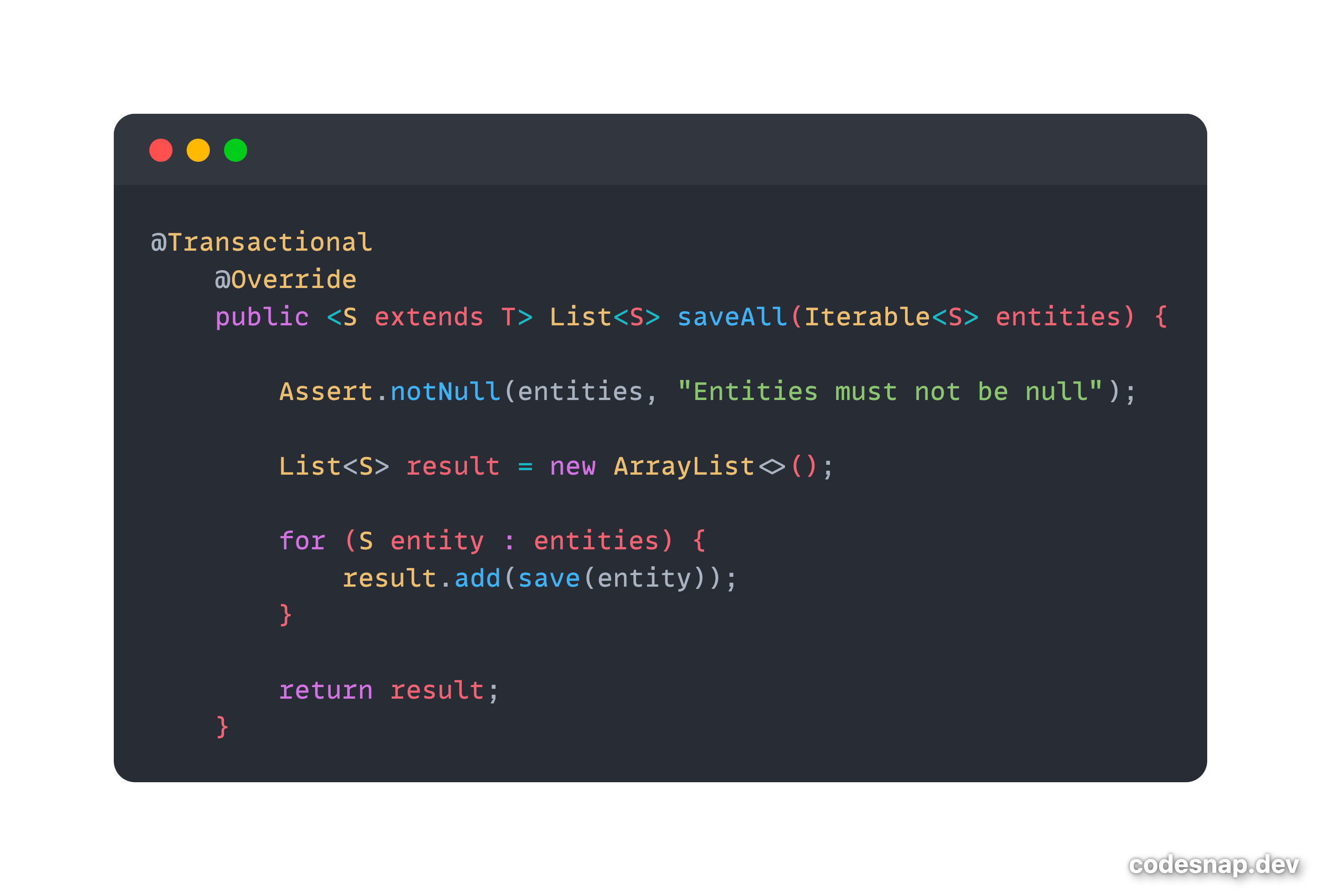 하지만 위를 보면 알 수 있듯이 saveAll의 경우 for문을 통한 loop를 수행하며 save하는 로직을 수행하기에, 개발자가 saveAll이라는 메서드를 이용하지않고 loop를 돌며 save메서드를 사용하는 것에 비해 드라마틱한 성능차이를 기대할 수는 없으며 성능적으로도 좋은 효과를 보지 못한다.
