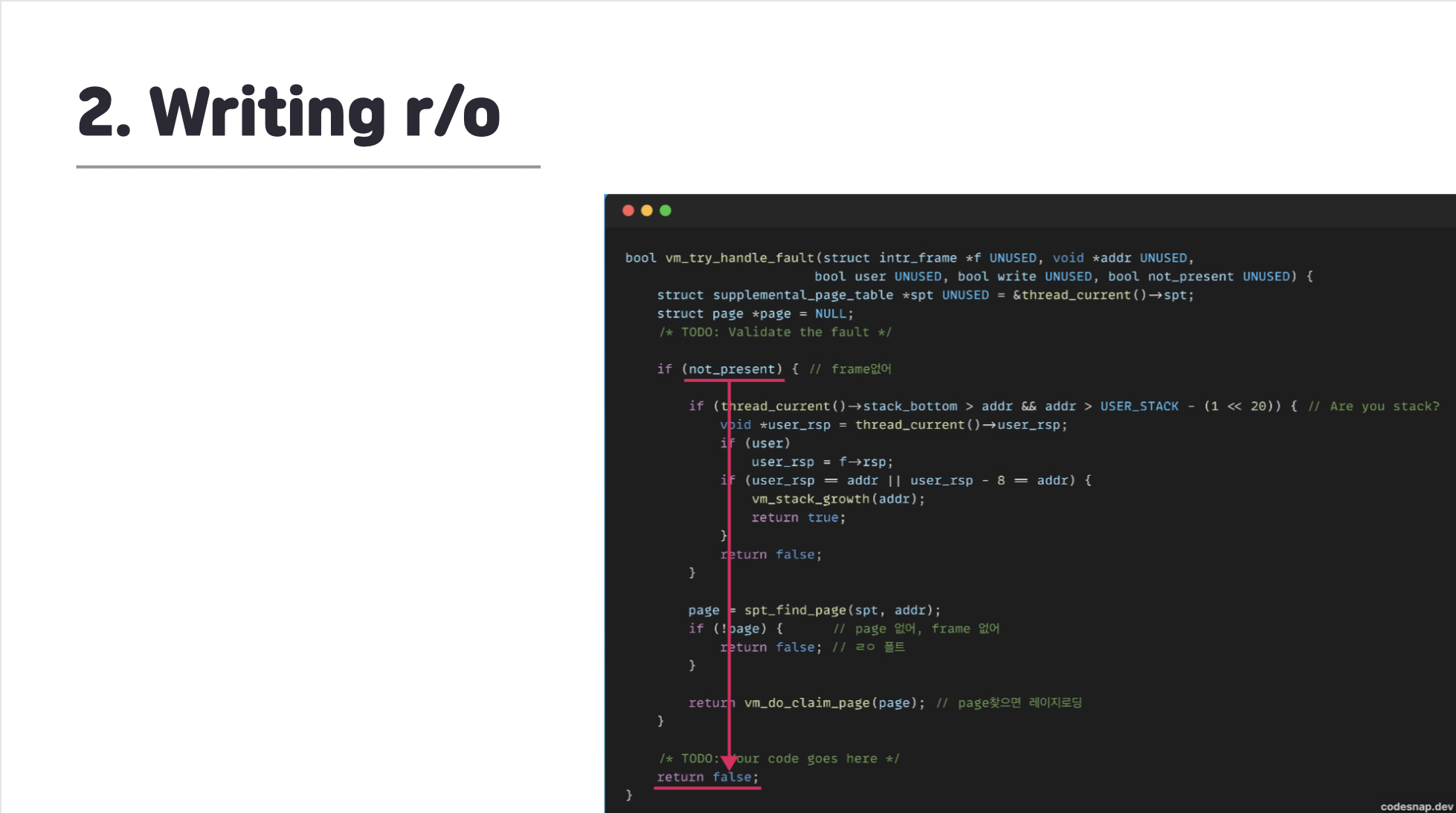 그리고 not_present 변수가 false라는 것은 frame이 할당되어 있는데 page_fault가 발생했다 라는 것으로 read-only 파일에 write를 하려고 해서 page_fault가 발생했다는 뜻이 된다.