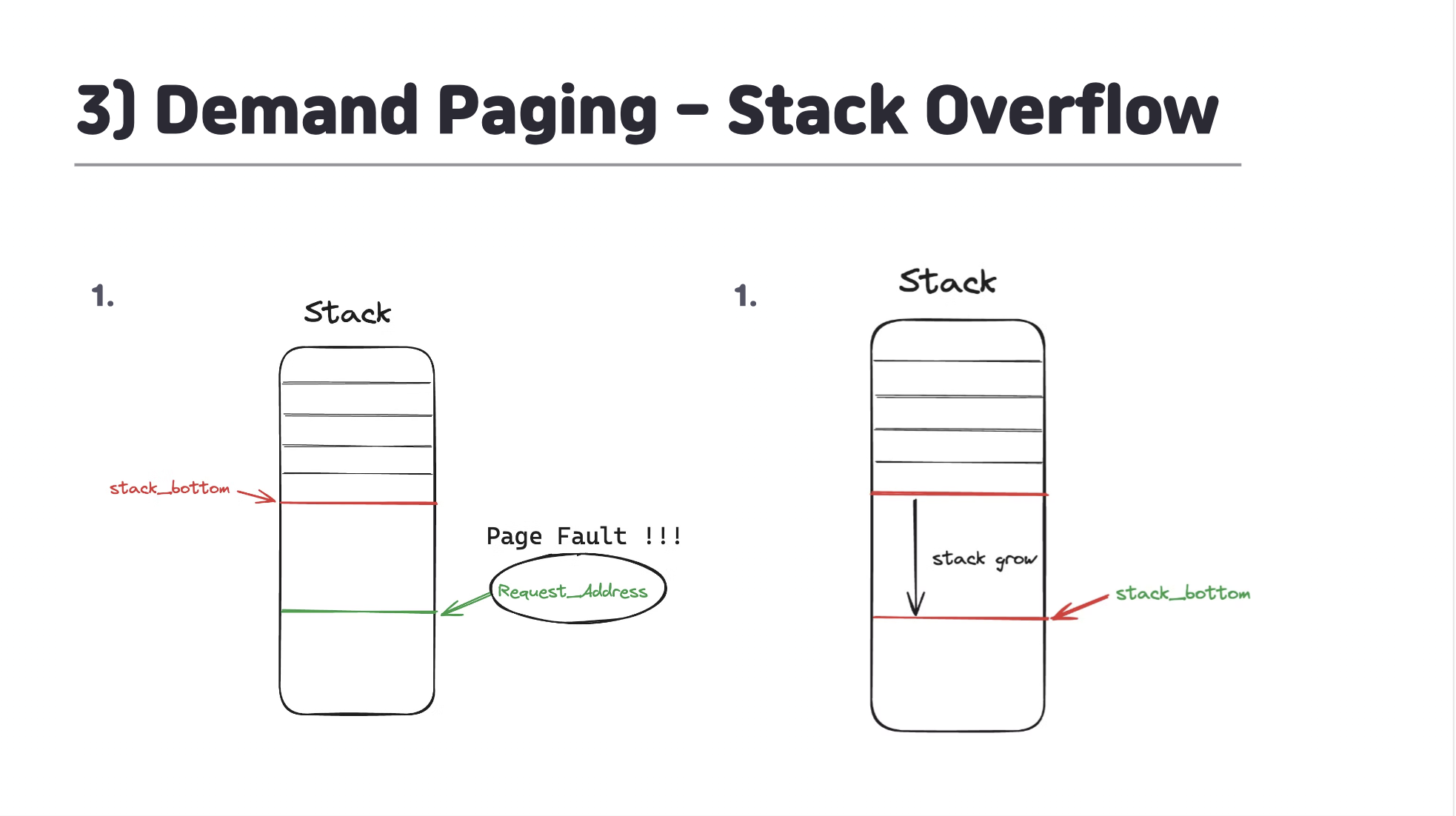 User Stack의 현재 Stack Bottom보다 아래의 주소에 페이지를 할당해달라는 요청이 들어오게 될 경우 Page Fault가 발생하게 됩니다.