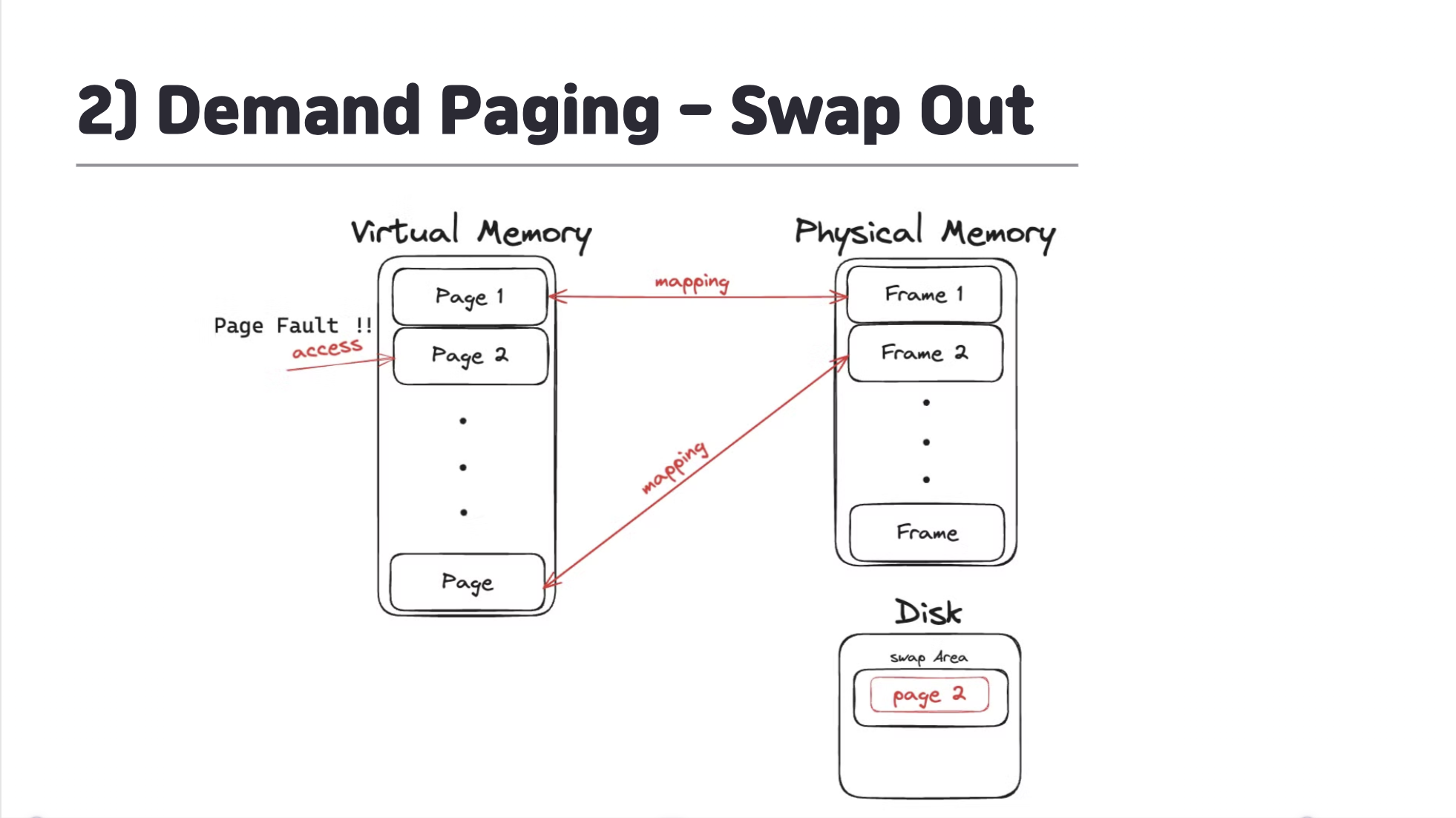 이후 해당 프레임과 매핑되어있던 페이지에 접근 시 해당 페이지에 매핑된 프레임은 피지컬 메모리가 아닌 디스크의 스왑영역에 존재하게 되어 Page Fault가 발생.