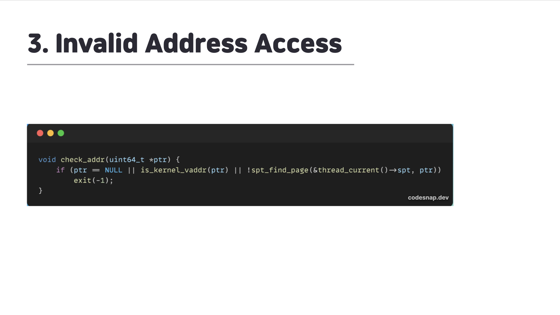 이러한 경우를 처리하기 위해 Mode Trap이 발생하는 Syscall 영역에 다음과 같이 비정상적인 접근일 경우 프로세스를 강제로 종료시키는 함수를 작성하였었다.