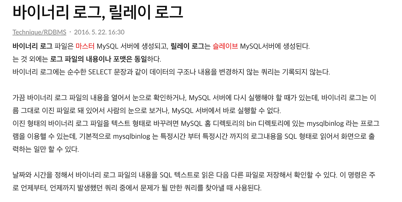 - Master 서버에서 바이너리 로그를 안정적으로 기록하기 위해 락(Lock)을 유지하고, 로그를 기록하는 행위 또한 디스크 I/O를 추가적으로 유발