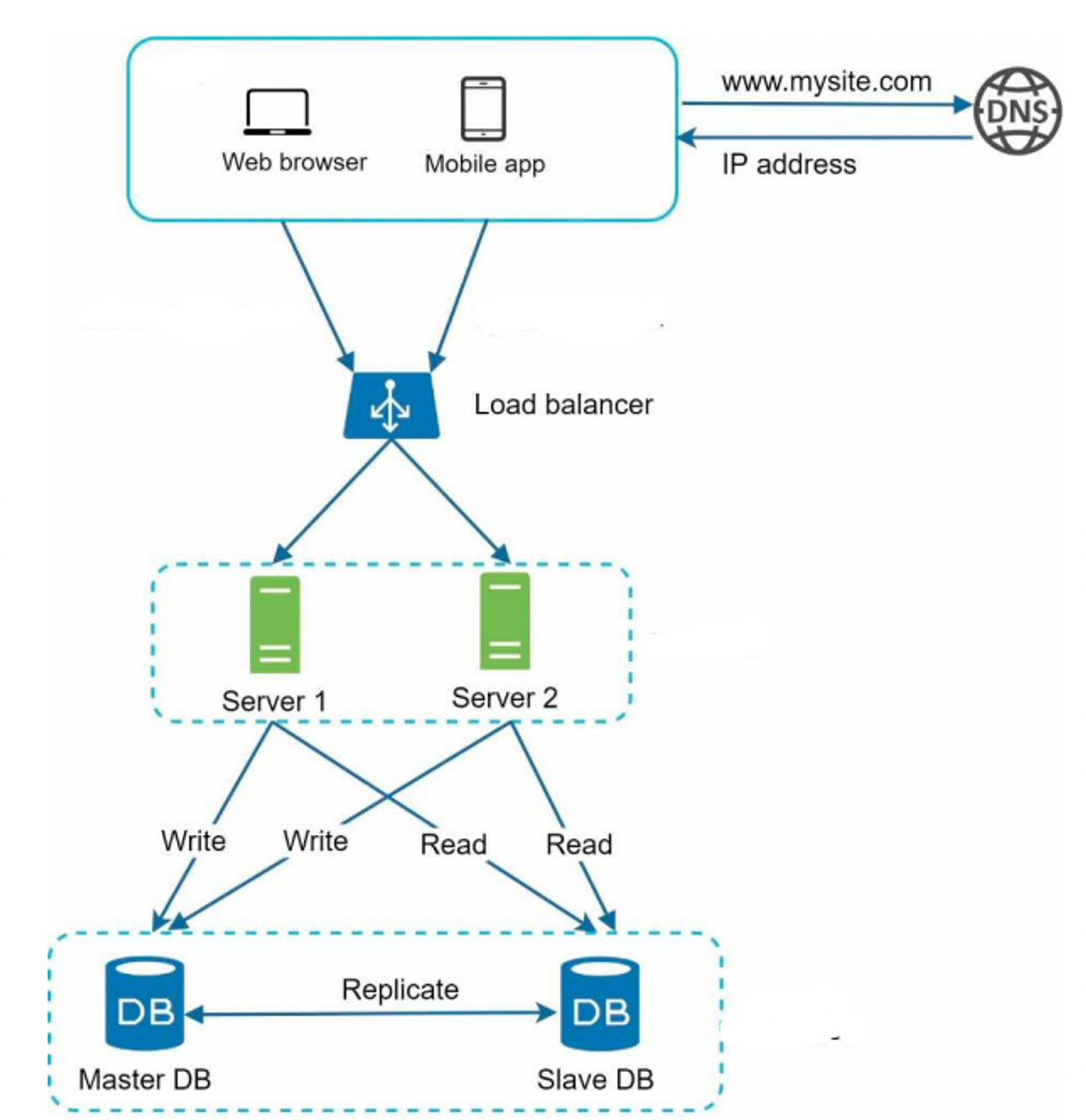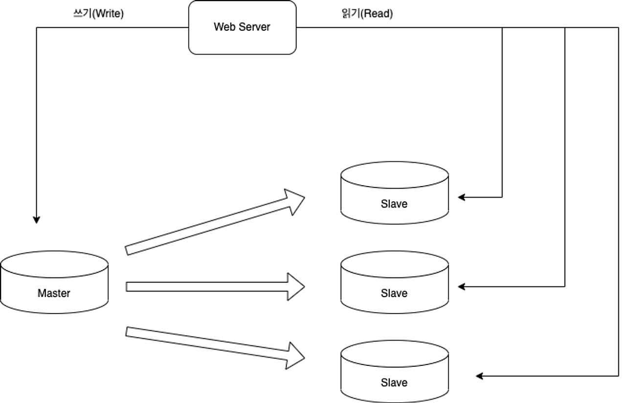 - 웹서버는 쓰기(Write)라면 MasterDB, 읽기(Read)라면 SlaveDB에 접근