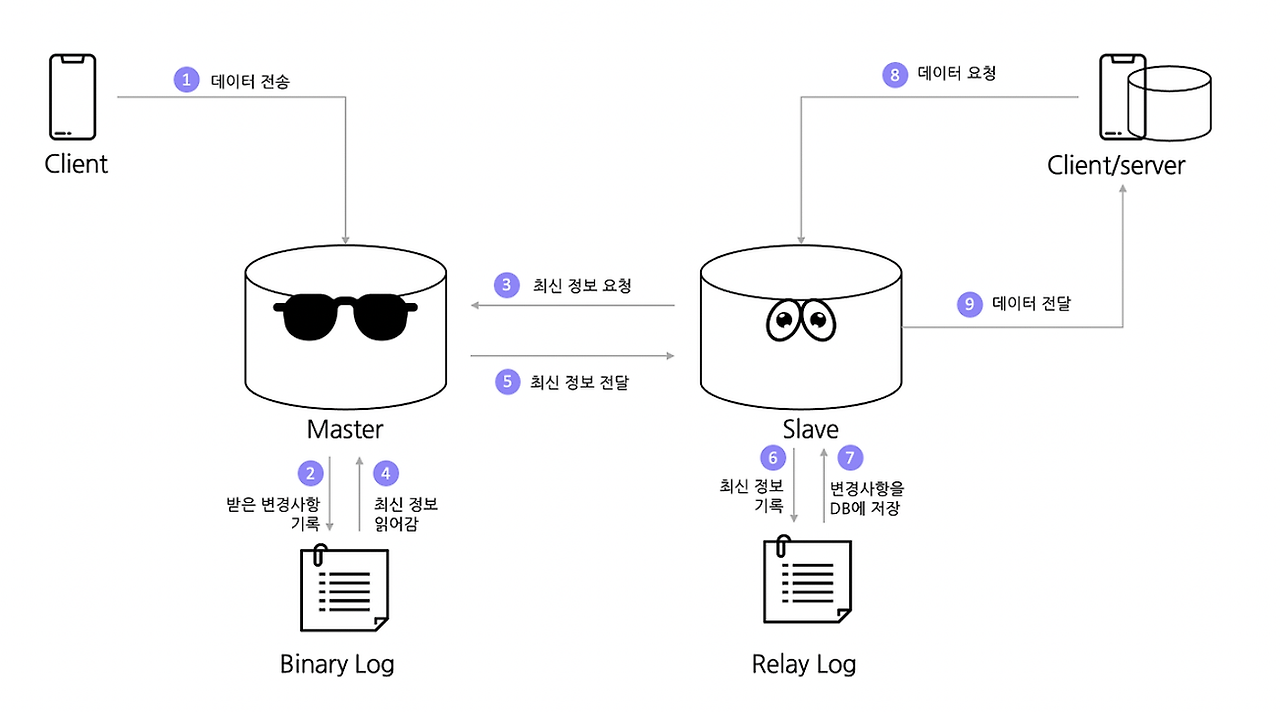 Binary Log(Mysql, MariaDB 기준)라는 임시(temp) 파일에 저장한다. Slave가 최신 데이터(Read)를Master에 요청한다.- 이때