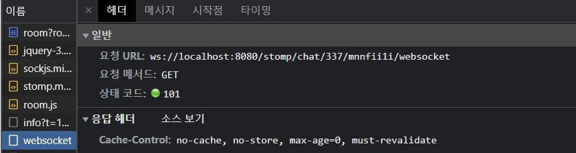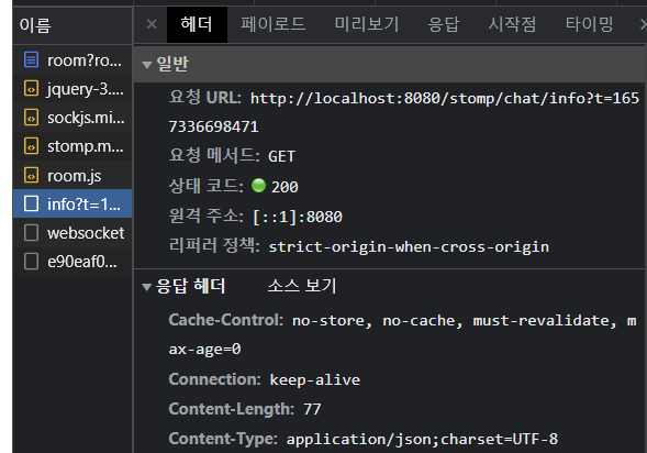 SockJs는 서버의 기본정보 즉 서버가 WebSocket을 지원하는지 , 전송과정에서 필요한 Cookie, 헤더의 정보, Cors 정보가 담긴 Origin 정보를 전달받는다. 이는 우리가 웹소켓을 최초실행할때 Info라는 url을 Get으로 가져와 확인한다. 이를 바탕으로 SockJS는 어떠한 전송 타입으로 사용할지 결정하고 순차적으로 실행한다.
