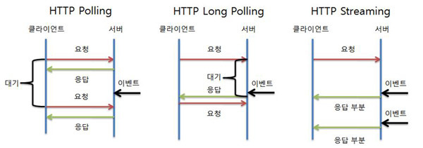 이러한 한계점이 있기 때문에 개발자들은 Polling이라는 기술을 도입하여서 일정 주기로 서버에 request를 보내는 방식으로 한계점을 해결하려했으나 불필요한 request와 커넥션이 생겨 문제가 되어 이벤트가 발생하는 경우에만 서버에서 response하는 Long Polling이라는 기술로 발달되었지만 이 또한 모든 이벤트에 response 되어 불필요한 커넥션이 많이 쌓이게된다. 이후 Streaming 이라는 기술이 나와서 서버로의 재요청이 사라지고 문제점이 해결되나했으나 지속적인 업데이트를 시키려고 무한정 요청을 대기시킨다. 이 기술의 경우 영상 스트리밍에 많이 사용된다.