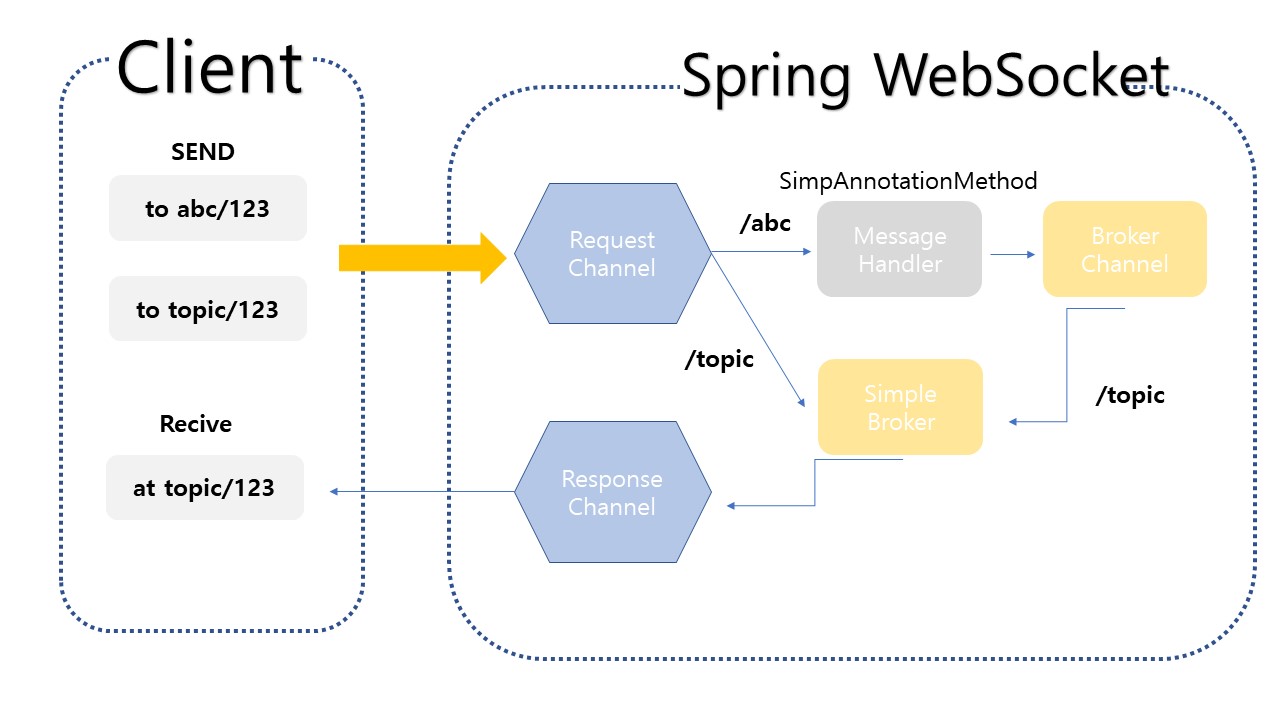 순서대로 설명을 하자면 abc/123과 topic/123으로 Send 요청이 들어온다. 이를 서버의 Requst 에서 받아 처리하게 되는데 Config에 등록된 url이라면 Simple Broker로 보내져 바로 Response처리하여 클라이언트는 받을 수 있게된다.