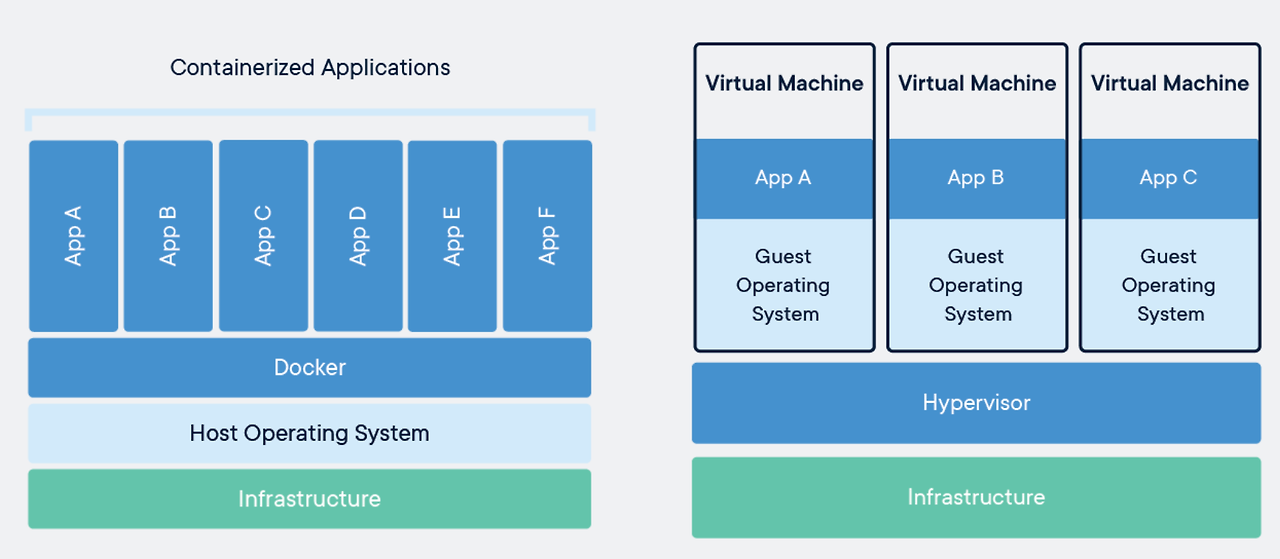 VM은 HyperVisor 위에서 실행되며, 이 하이퍼바이저가 컴퓨터 VM 별로 인프라 리소스를 배분하는 역할로 사용한다. 또한 각 VM에선 독립적인 Guest OS를 가지고 있는데, 독립적인 플랫폼을 하나씩 증가시킬 때마다 불필요한 OS를 만드는 작업에 대해서 계속해서 해야한다.